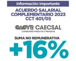 Leer másAcuerdo Salarial UTHGRA -CACYR CAECSAL 401/05 Acuerdo Complementario 2023 Se acordó el Pago de una Suma No Remunerativa No al Básico del 16% como Complemento