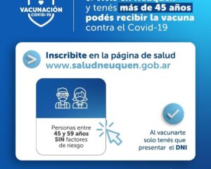 El Gobierno de la Provincia de Neuquen continúa ampliando el plan de vacunación más importante de la historia. Si tenés más de 40 años, sin