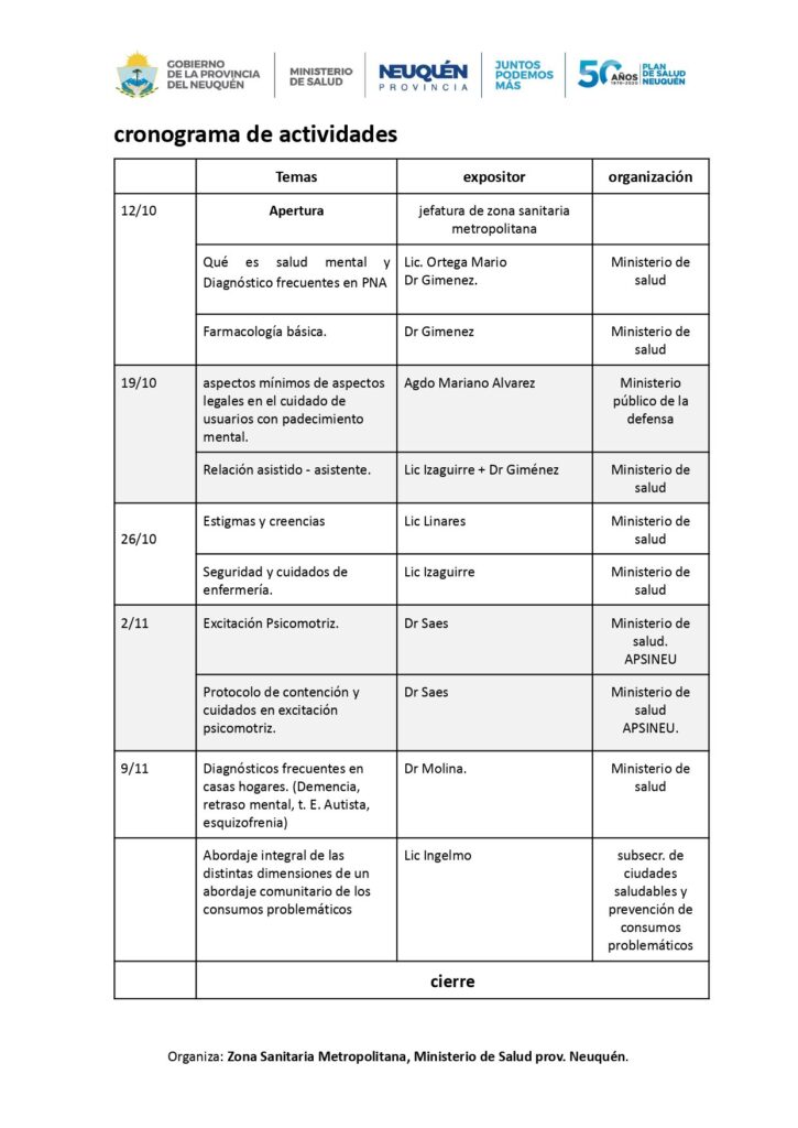 En coordinación con la Zona Sanitaria Metropolitana dependiente del Ministerio de salud de la Provincia de Neuquén, se desarrollará en las instalaciones del Sindicato Uthgra Secc. Neuquén, la capacitación de Sensibilización en Salud Mental destinado a profesionales de Enfermería.