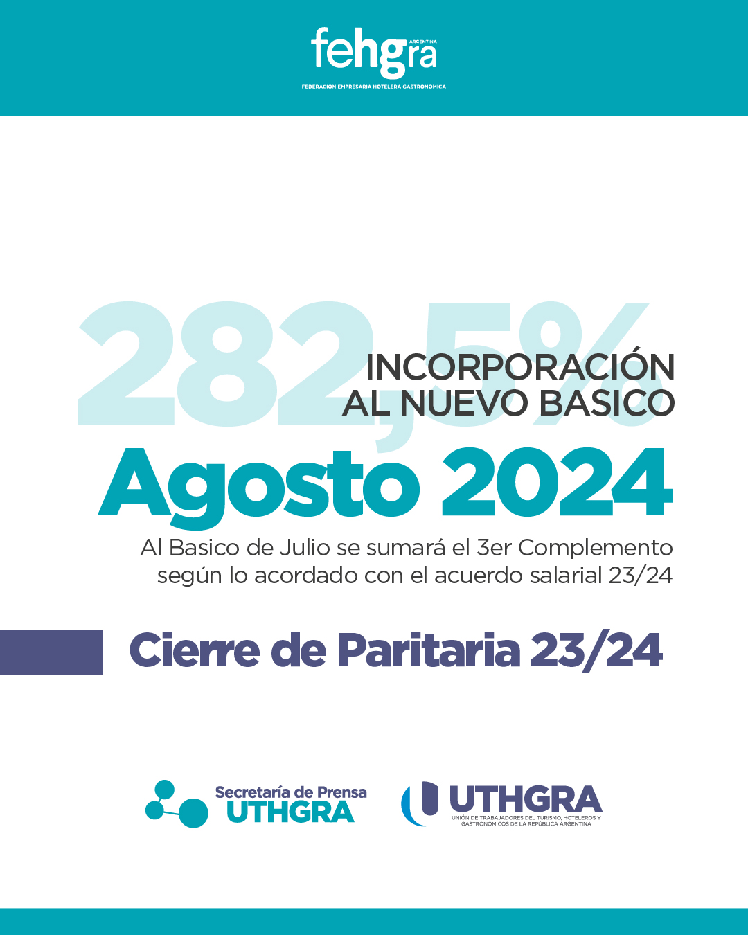 -Se acordó el incremento del ,% del acuerdo 23/24, alcanzando este acuerdo un 282.5% de aumento en este CCT, abonándose en el mes de JULIO. Asimismo, este complemento se incorpora al nuevo básico de junio en el mes de AGOSTO 2024.