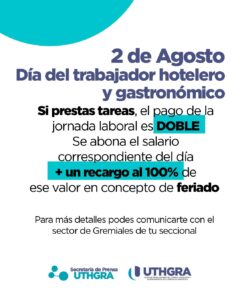 Recordá: Día Nacional del Trabajador Hotelero y Gastronómico. 1 agosto, 2024 vo000402 Afiliados, Sin categoría, Últimas Publicaciones 2 De Agosto Si prestas tareas, el pago de la jornada laboral es DOBLE. Se abona el salario correspondiente del día + Un Recargo al 100% de ese valor, en concepto de FERIADO