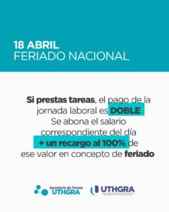 18 de Abril; Feriado Nacional 16 abril, 2025 vo000402 Artículos de Interés, Últimas Publicaciones ́: 18 de ABRIL (Viernes Santo)Si prestas tareas, el pago de la jornada laboral es DOBLE.Se abona el salario correspondiente del día + Un Recargo al 100% de ese valor, en concepto de FERIADO.