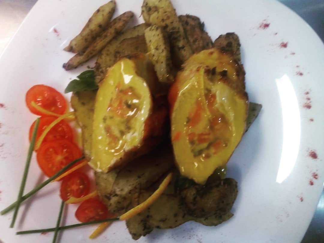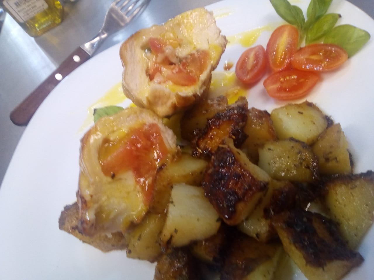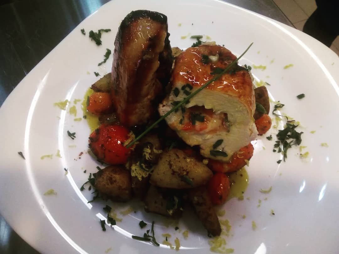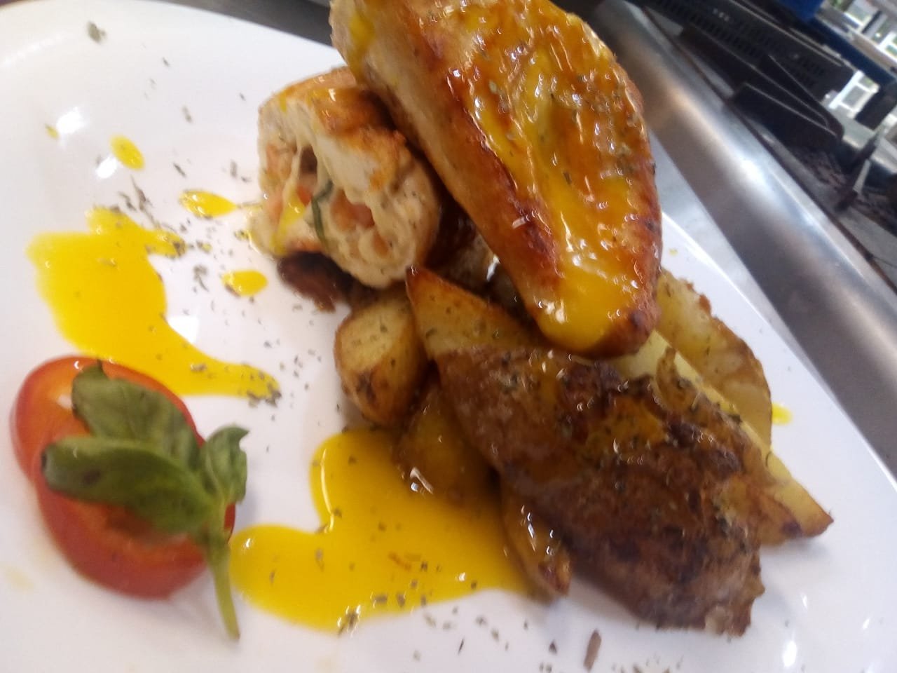 Curso de Capacitación de Cocina: Preparación de Pechuga de Pollo rellena con muzzarella, tomate y albahaca, con salsa de Naranja y Papas a las finas hierbas.