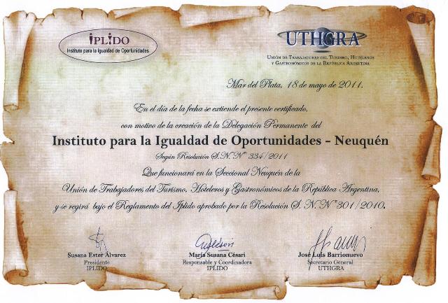 La UTHGRA Seccional Neuquén y Alto Valle de Rìo Negro informa la creaciòn del INSTITUTO PARA LA IGUALDAD DE OPORTUNIDADES (IPLIDO)Delegaciòn Neuquén.
