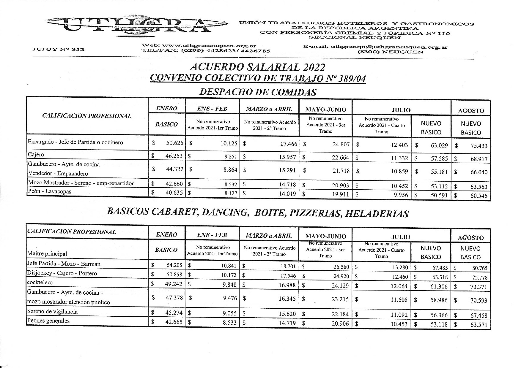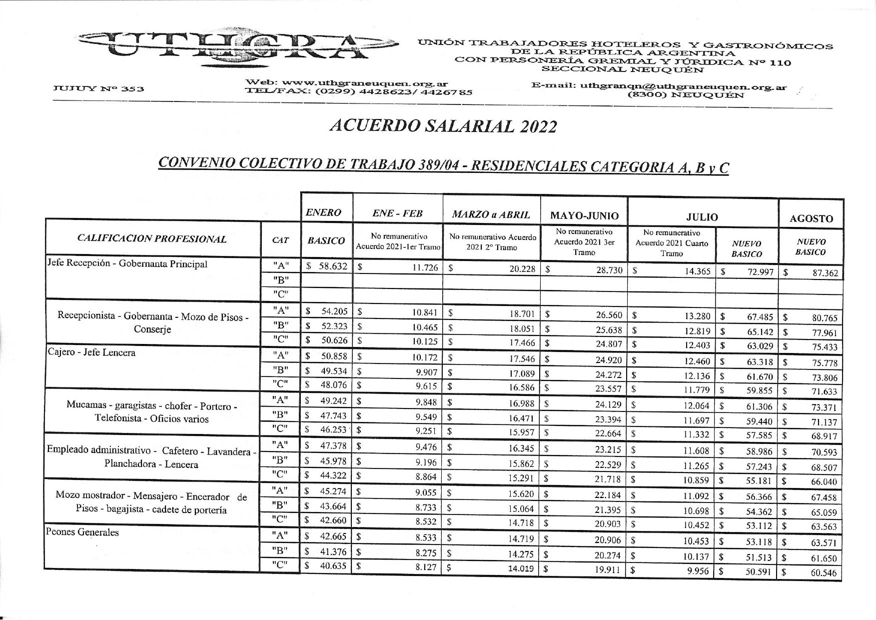 Escala Salarial 2022, correspondiente al convenio 389/04 6 abril, 2022 vo000402 Sin categoría Escala salarial Hoteles y Restaurant Escala Salarial despacho de comida y otros. Escala Salarial Confiteria Escala Salarial Residenciales detalle de adicionales de convenio.
