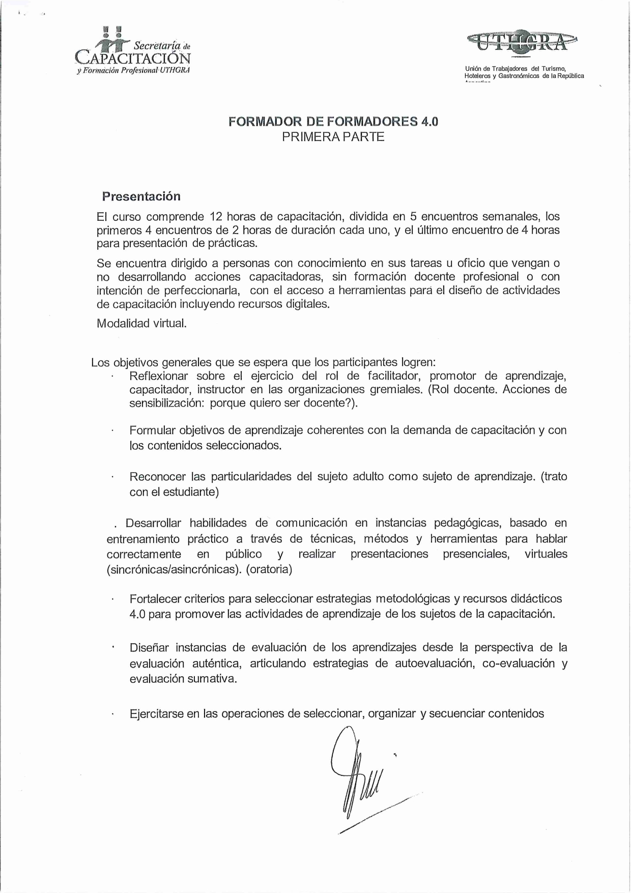 Estimados Compañeros: la Secretaria de Capacitación y Formación Profesional de la UTHGRA los invita a participar de un nuevo CURSO DE FORMADOR DE FORMADORES 4.0, que se desarrollara en forma virtual a través de la plataforma ZOOM, durante el mes de Junio los días Jueves de 10 a 12 horas.